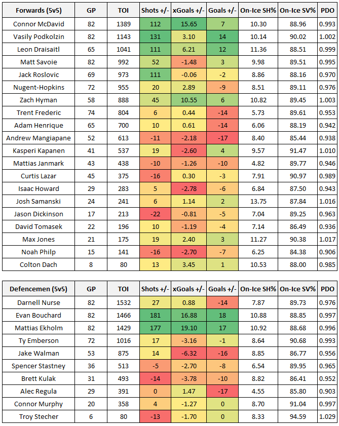 Here’s a quick look at the Oilers’ skaters, and their on-ice numbers so far sorted by ice time. Included is each player’s on-ice shot differential, expected goal differential and actual goal-differential. And for additional context, each player’s on-ice PDO is captured. A basic heat map is applied to show how players compare within their cohort.
