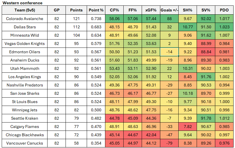 Below are the even-strength (5v5) numbers for each team in the western conference (sorted by points percentage). These include goal-share results and shot-share metrics, which give us a sense of which teams have strong underlying processes — and which are over- or underperforming. At the end of the table, you’ll find each team’s shooting and save percentages. A simple heat map highlights which clubs are excelling (green) or struggling (red). Note: all shot-share metrics are score- and venue-adjusted per Natural Stat Trick’s methodology