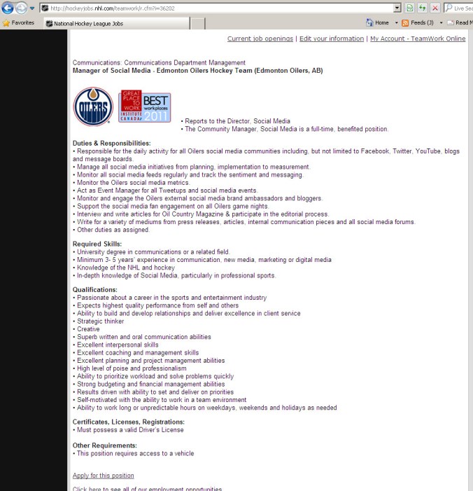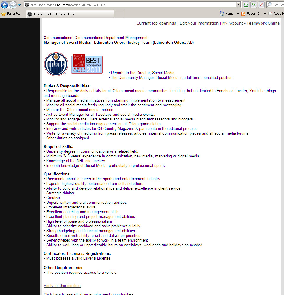 The Edmonton Oilers are looking for a manager of social media. Job description and requirements are below: