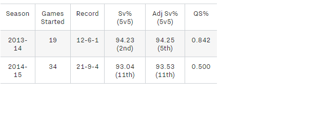 Here’s a high level summary of his performance since 2012-2013. Please note that the save percentages are for five-on-five even strength and have their rankings in parentheses (Sources: War on Ice, Hockey Reference and Hockey Abstract).