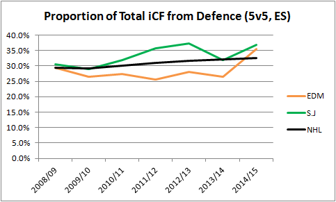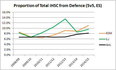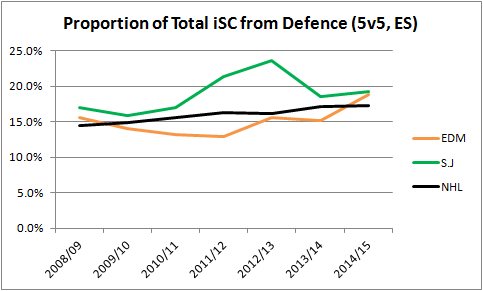 Just to confirm what I was seeing, I looked at what percentage of the Sharks shot attempts at even-strength were from defenceman and compared that to how the Oilers defenceman have done. My only issue here is Brent Burns who has played wing and defence over the past few years, so I can’t stand by the numbers 100%. In this post, I’ve considered him a defenceman, except in 2013/14 when he appears to have been on wing full time. The numbers might be slightly off, since I could not find exact dates for when he might have played defence or forward.