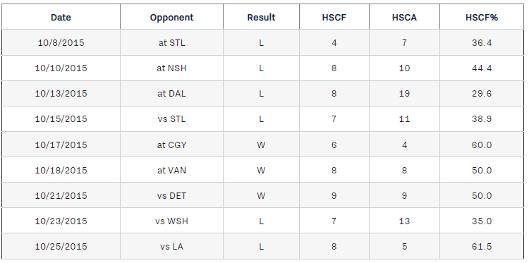 You have to understand why McLellan may have been a little annoyed after the game and at the media availability on Saturday (Source: 630 CHED). Fact is, he’s had a history of getting a higher proportion of high danger chances in games and ensuring that the opposition is limited. He regularly finished in the top five league-wide when it came to the overall quanity of high danger shots and often had a high proportion of those shots. Here’s how he did compared to the rest of the league and, as always, I included Edmonton for fun.