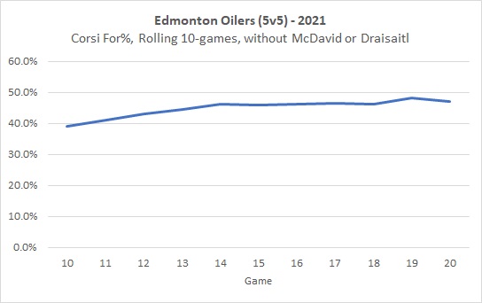While the group’s PDO is what’s largely driving results, it’s also encouraging to see the depth players getting a higher proportion of the total shots. Remember this is a group that posted a Corsi For% below 40.0% early on in the season, but things have been gradually trending upwards towards the 50.0%, break-even mark. Below is a breakdown of the team’s Corsi Forpercentage over rolling ten-game segments, without McDavid or Draisaitl on the ice. Note that the Corsi For percentage has been score adjusted to factor in the time the Oilers have led games.