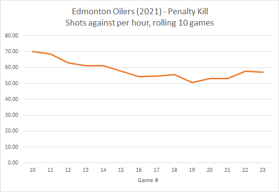 The good news is that the Oilers are seeing some progress on the penalty kill this season, as their rate of shots against has gradually been declining recently. Over the last ten games, they have been allowing closer to a league average rate of shots, and that might be due to some adjustments they’ve made to player deployment.