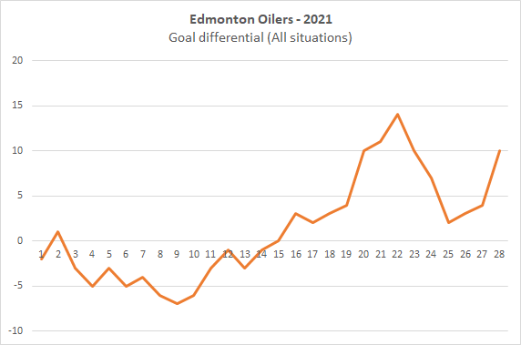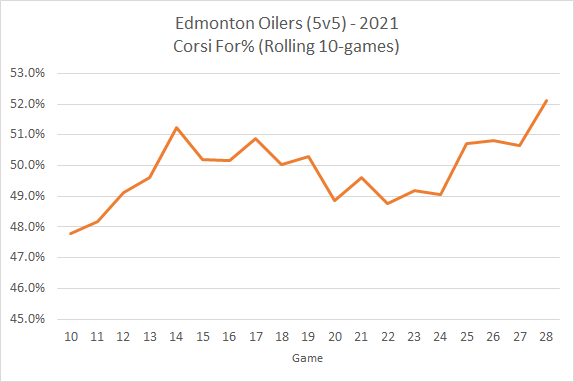 The Edmonton Oilers are half-way through this condensed season, sitting third in the North division with a points percentage of 0.607%, only behind Toronto and Winnipeg. It’s been a nice turnaround from the last time we checked in in early February when the Oilers ranked sixth in the division after 11 games and were struggling at even-strength and on the penalty kill.