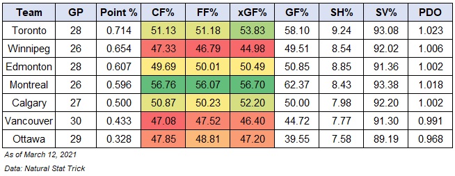 The Edmonton Oilers are half-way through this condensed season, sitting third in the North division with a points percentage of 0.607%, only behind Toronto and Winnipeg. It’s been a nice turnaround from the last time we checked in in early February when the Oilers ranked sixth in the division after 11 games and were struggling at even-strength and on the penalty kill.