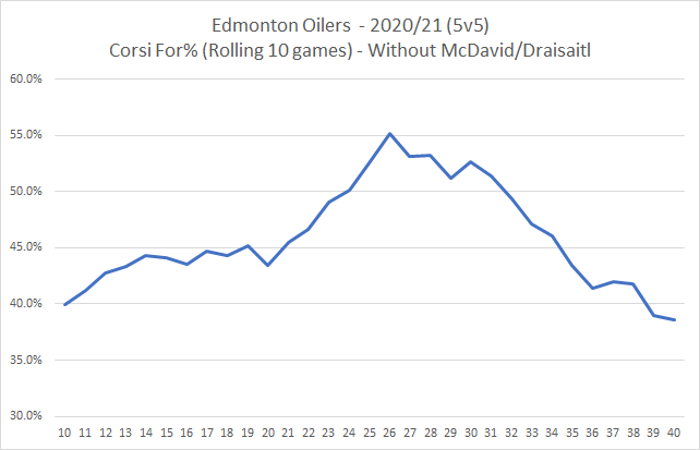 The two together over the last ten games have seen their Corsi For% drop down to 44.86%, while their share of Expected Goals For% is down to 36.03%. Again it’s on the offensive side of things, as the Oilers are generating less than 48 shot attempts per hour with them on the ice, and that’s playing predominantly with McDavid or Draisaitl. Keep in mind, 80% of their total ice time is with one or both of these guys. In roughly 27 minutes playing with depth players over the last ten, Nurse and Barrie have shot-share numbers under 20%, which is incredible considering their reputations of being offensive drivers this season.