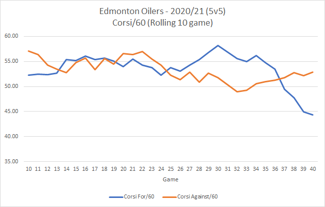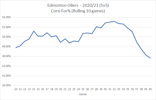 Over the course of the season, the Oilers were trending well, posting a ten-game stretch where they controlled over 52.0% of the total shot attempts (score adjusted) – a level that top end teams with points percentages above 0.600 typically finish a season with. But things have gone downhill for the Oilers recently, largely due to their offence drying up. At one point, they had a stretch of ten games where they were generating 56.75 shot attempts per hour, which is nothing great and closer to league average levels. But that rate has dropped by 28% over the last ten games, with the Oilers generating only 44.33 shot attempts per hour. For context, that’s worse than what Detroit and Buffalo have mustered over the season. Whether it’s the offensive rate of shot attempts, unblocked shot attempts, expected goals – the Oilers rank either 30th or 31st when looking at the last ten games for every team.