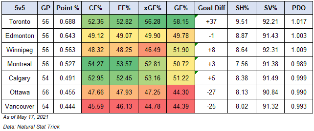 The Oilers are one of the rare teams to finish their season with a points percentage above 0.600 and have a 5v5 goal-share below 50.0% – only better than Ottawa and Vancouver in the North division. The annual top teams in the NHL have an average goal-share of 53.58%, with a Corsi For% and Expected Goals For% around 52.0%. The Oilers weren’t in that range, and as I wrote about a couple weeks ago, they rank quite low among all the other 2021 playoff teams. Regardless, they finished with one of their highest points percentages in franchise history thanks in large part to their franchise player and their success on special teams.