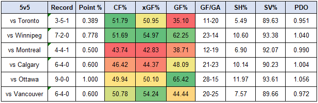 Seeing these overall results, I was curious to know who the Oilers had success against, and which teams they had issues with. Below are their numbers at even-strength (5v5) against each team, sorted by how their opponents finished in the North.