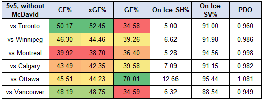 - The Oilers without McDavid were pretty much owned by every team in the North, posting a goal-share below 40% against each club except for Ottawa.
