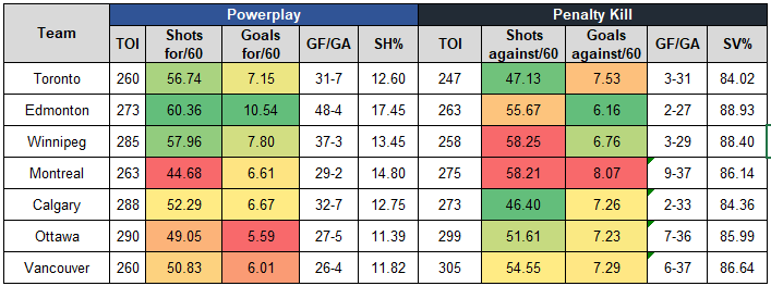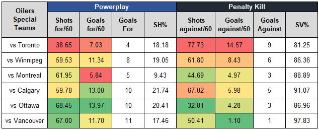 - The Oilers powerplay was excellent, generating lots of shots against every team except for Toronto. The Leafs and Habs allowed the lowest rate of goals against versus Edmonton. The Oilers powerplay scored 69% of their powerplay goals against non-playoff teams.