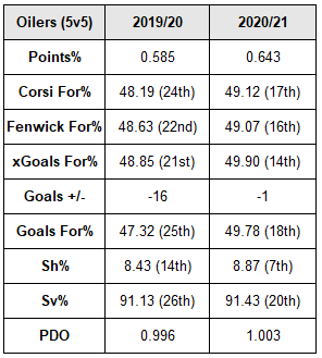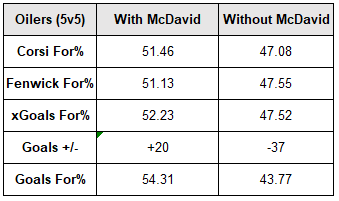 Over the past two seasons, the Oilers have a goal-differential of +20 with McDavid on the ice at even-strength (5v5), and a -37 goal-differential without him. The team has spent far more time without the puck and in their own zone when McDavid is on the bench, posting a Corsi For% of 47.08% and a Fenwick For% of 47.55%.