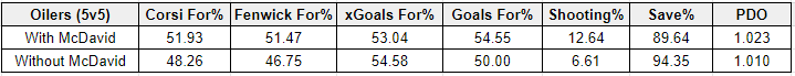 Below is a breakdown of the Oilers on-ice even-strength (5v5) numbers so far this season with and without McDavid. Definitely a big positive that the Oilers aren’t getting outscored at even-strength (5v5), but I do wonder if their numbers, as well as McDavid’s, could be better if they had better options than Barrie on the blueline. Definitely something to track this season, and we’ll have to see if the coaching staff and management can figure their issues out. The sooner, the better.