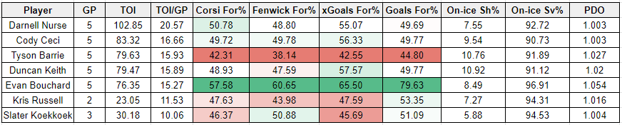 For context, below is the team’s Corsi For%, which gives us a sense on how often the Oilers have the puck and control the flow of play, along with with Fenwick For% and Expected Goals For% which serve as proxies for scoring chances. These have all been score and venue adjusted according to Natural Stat Trick’s methodology. Should also note that the Expected Goals For% is much higher for now, but it may have to do with the sample size we’re dealing with. I’d expect it to level off in the next few weeks and align closer to the Fenwick For%.