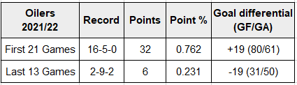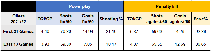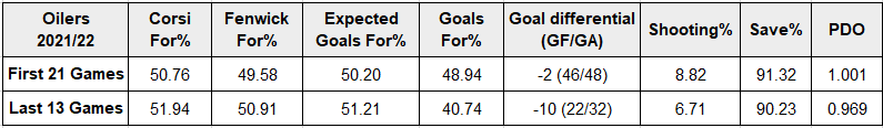 There’s definitely been a drop off when comparing the results between the first 21 games of the season against the last 13 games. Prior to December 2nd, the Oilers were the top team in the league with a 0.762 points percentage, driven completely by their special teams. The Oilers powerplay scored 23 times in only 92 minutes – a scoring rate of 14.94 goals per hour, which ranked the best in the league. Their penalty kill allowed only 8 goals in 113 minutes – rate of 4.26 goals against, good for fourth best in the league. And the Oilers special teams had to be exceptional as the team struggled at even-strength (5v5), posting a -2 goal differential and some very mediocre shot-share numbers.