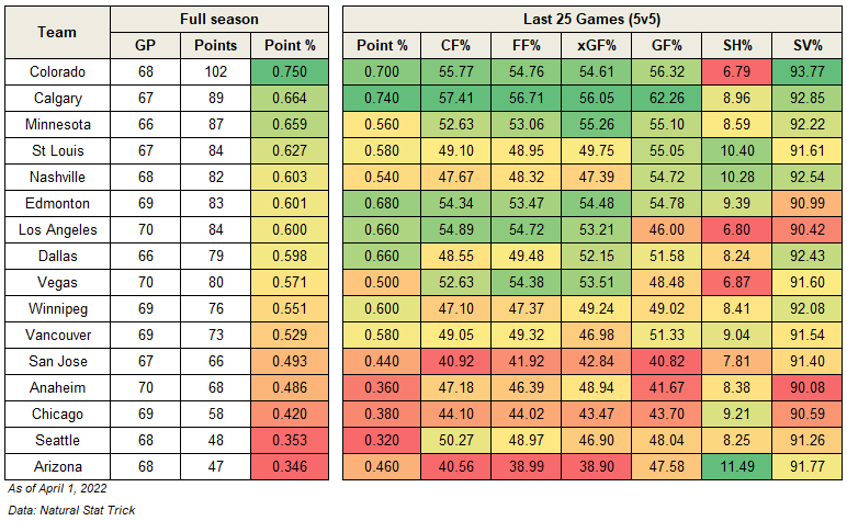 The table below sorts the western conference teams by their full-season points percentage, with Colorado, Calgary and Minnesota leading the way and Edmonton ranking sixth. I’ve also included each team’s even-strength (5v5) results over their last 25 games as reflected by their goals for percentage (GF%), as well as the underlying shot-share metrics such as Corsi For% to measure how well the Oilers as a team control the flow of play, as well as Fenwick For% and Expected Goals For% to gauge how well they control the overall share of scoring chances. Team shooting percentage and team save percentage has also been included to capture the player-driven factors that may be impacting the overall results. A glossary can be found at the end of this article.