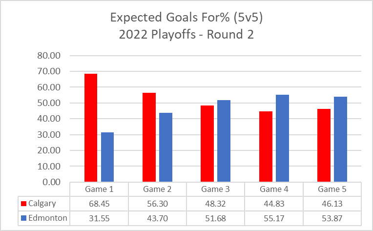 While it looks like the Oilers were out-shot by the Flames, it becomes evident when you dig into the data that the Oilers were the much better team when it came to generating quality chances as reflected in their expected goals for percentage, and they gradually improved over the course of the series.