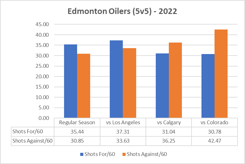 The other indication that things were likely going to go sideways against Colroado was the Oilers declining defensive play in the previous rounds and the increasing rate of shots against.