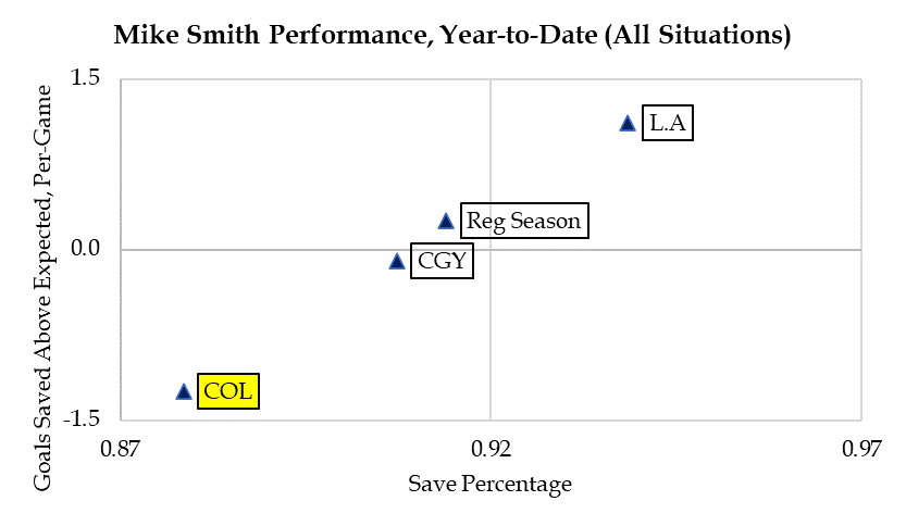 Compounding matters was the Oilers goaltending, which posted a 89.68% 5v5 save percentage in the second round against the Flames – the second worst save percentage among the eight teams in the second round. And only better than Calgary’s that had to face a supernova version of Connor McDavid. Smith’s performance gradually declined over the course of the playoffs, and the team wasn’t playing well enough to make up for it.