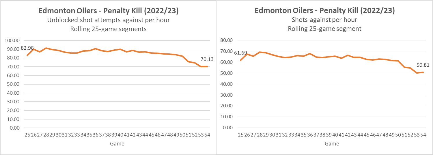 When it comes to the team’s penalty kill performance, the Oilers have gradually improved at limiting unblocked shot attempts (a proxy for scoring chances) and shots on goal. In the first twenty-five games, they were allowing the ninth highest rate of unblocked shot attempts (82.98) and the sixth highest rate of shots against (61.69). In the most recent twenty five game stretch, they’ve seen their rate of unblocked shot attempts drop by 15.5% to 70.13 (tenth lowest in the league) and their rate of shots against drop by 17.6% to 50.81.