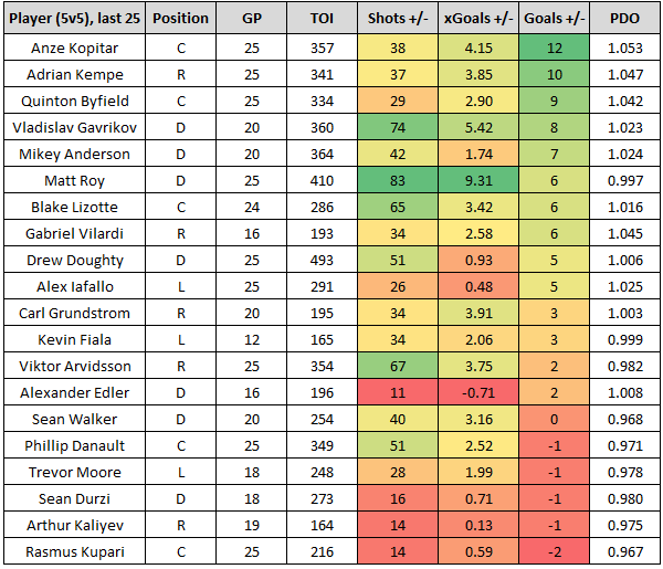 While not at the Oilers superhuman levels, the Kings did have some success on the powerplay, generating 8.39 goals per hour in their last twenty-five games, which ranked ninth in the league. The Kings team shooting percentage was one of the best in the league with 17.71%, which was critical considering they generated some of the lowest rates of shots and scoring chances.