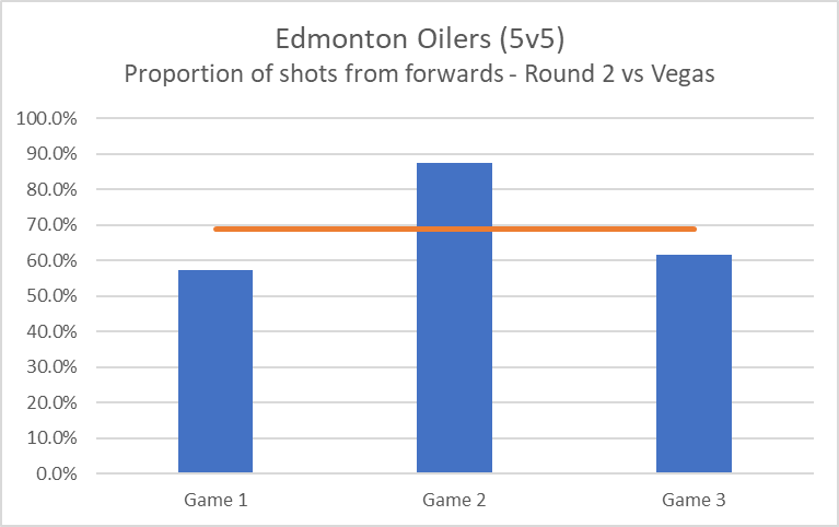 Of the 63 shots the Oilers have been able to muster against Vegas, 42 have been from forwards – a share of 66.7%. In their game one loss, the Oilers forwards took 57.1% of their teams total shots. And in the game three loss, they took 61.5% of the team’s total shots. In the game they won, the Oilers forwards had a much higher proportion of shots, something the club really needs to replicate to improve their odds of winning games. The table below breaks down the proportion of shots from the forwards by game, with the orange line representing the Oilers regular season average.
