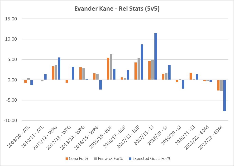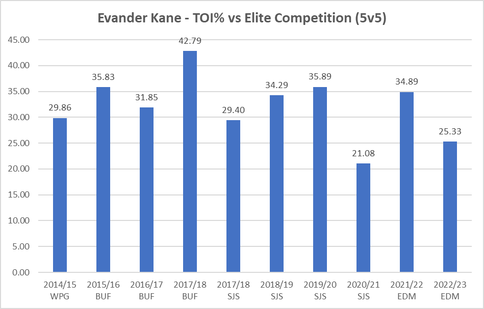 Whether it’s his performance, or the injuries he’s sustained, the Oilers coaching staff has made adjustments to how Kane has been deployed. Just over 25% of his total ice time at even-strength last season was against elite-level competition, which is the second lowest proportion of ice time against this group in his career. For context, in his first two full seasons in San Jose, Kane spent around 35% of his ice time against elite-level competition (Source: Puck IQ).