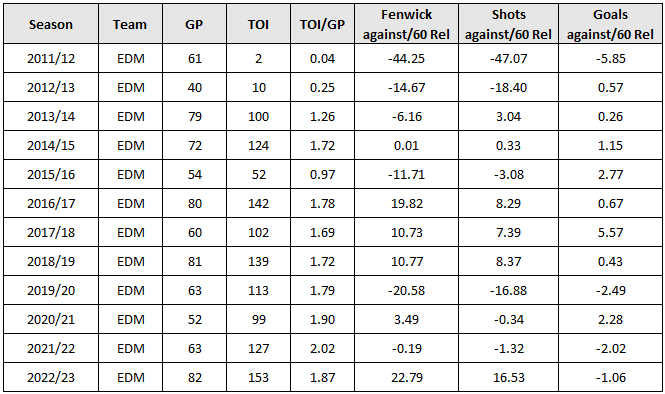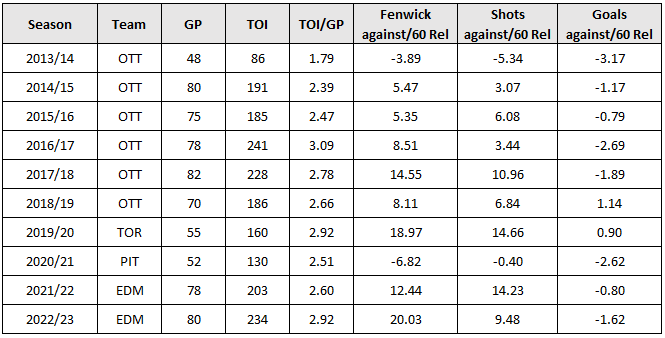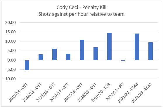 The other option to consider is removing Ceci altogether from the penalty kill. For pretty much his entire career, Ceci’s on-ice rate of shots against on the penalty kill has been higher than his team’s rate. Put another way – over his career, Ceci’s team’s consistently did a better job at suppressing shots against when he wasn’t on the ice. The only time Ceci’s numbers were closer to his team’s levels was in Pittsburgh, the year before the Oilers signed him – and this appears to have been an outlier season. And unfortunately for him and the Oilers, his on-ice shot suppression number continue to be poor on the penalty kill and in-line with his career levels.