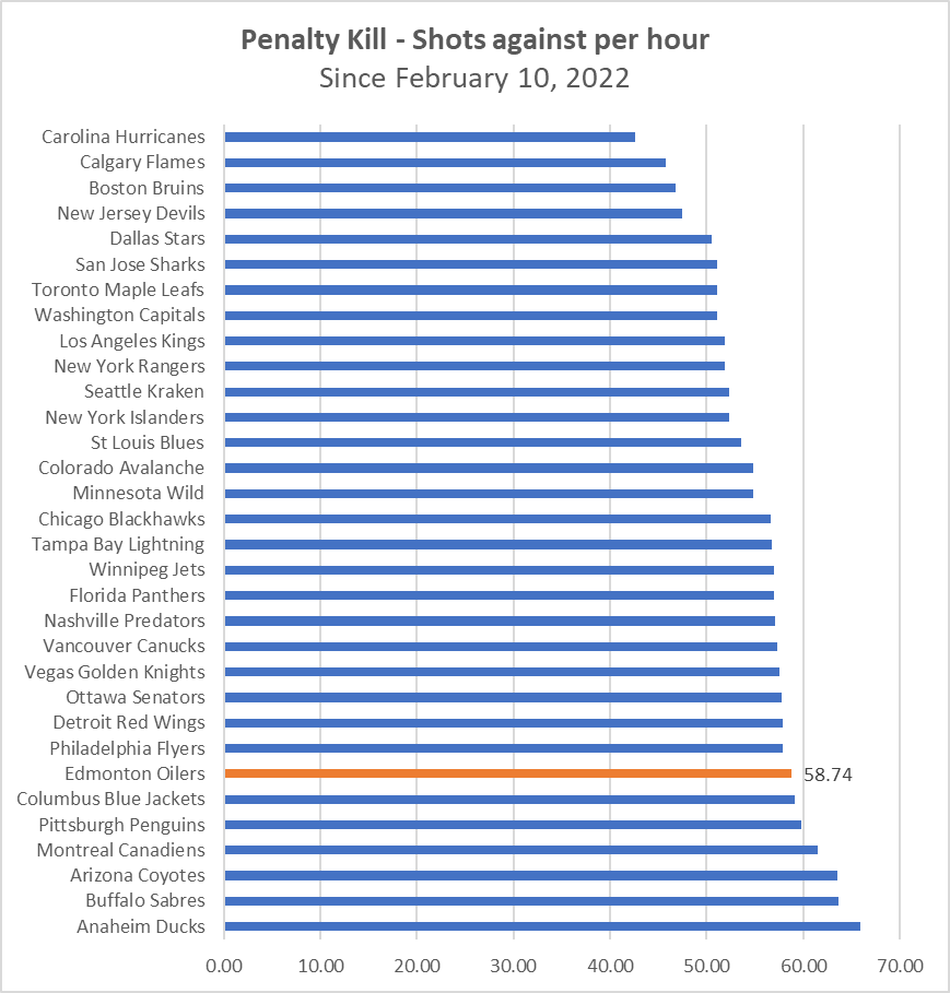 Since February 10, 2022 when Woodcroft became head coach, the Oilers penalty kill has allowed the 7th highest rate of shots against in the league and the 10th highest rate of scoring chances (using Fenwick, or unblocked shot attempts as a proxy). Thanks to some league-average goaltending, the Oilers penalty kill results haven’t been a complete disaster, with the team allowing 7.75 goals against per hour, which has ranked 17th in the league.
