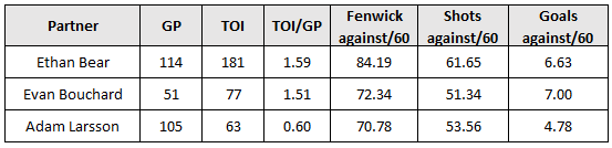 Under the previous coaching staff prior to Woodcroft’s arrival, Nurse’s three most common penalty kill partners were Ethan Bear, Evan Bouchard and Adam Larsson. And his best performance numbers (again looking at shots against) was with the one defender who’s still with the Oilers, as he and Bouchard limited the rate of shots against to 51.34 per hour – just better than league average (~54 shots against per hour). It’s unfortunate that Nurse is the one that needs help and doesn’t always drive positive outcomes, but at this point you’re just trying to get as much value as you can from the player. The other option is just having Bouchard and Ekholm take more of the penalty kill minutes, as those two showed good chemistry together as regular partners at the end of last season, and this way it doesn’t disrupt the defence pairings at even-strength.