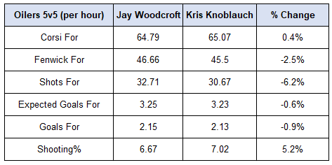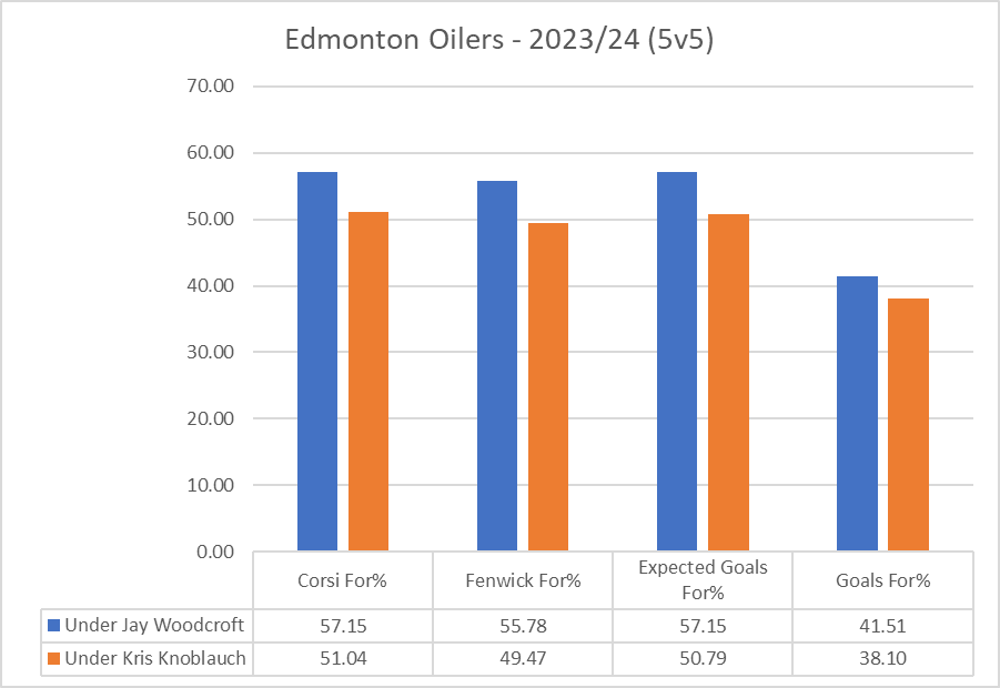 Below is a quick comparison of how the Oilers have performed under the two coaches at even-strength. Under Woodcroft, the Oilers were consistently one of the better teams in the league when it came to puck possession and controlling scoring chances. But under Knoblauch, the team has seen around an 11% decline in these metrics, now hovering below league-average levels.