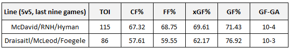 The top six forward group, now featuring Ryan McLeod and Warren Foegele, is also crushing it right now since the Oilers made adjustments during their game against New Jersey on December 21st. Here’s how the top two line have performed over the last nine games at even-strength.