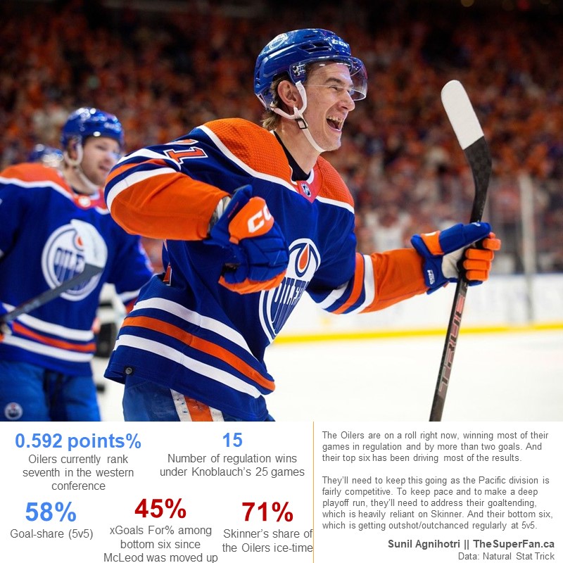 What’s especially impressive is the number of regulation wins the Oilers have posted since the coaching change. Since Kris Knoblauch took over behind the bench, the Oilers have won 19 games with 15 of them done without overtime or shootout. That’s the fifth highest number of regulation wins in the league since November 12th (when the coaching change happened). Worth noting that 12 of their wins (or 63%) have been by two goals or more – which is a better indicator of the team’s talent than one-goal games.