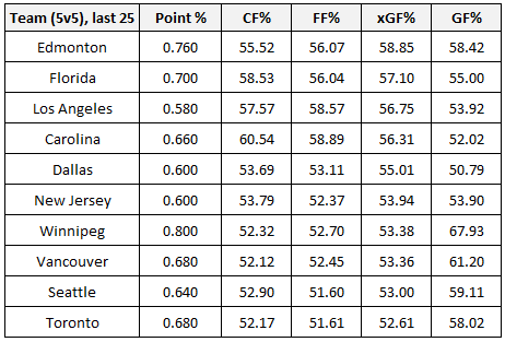 And while the Oilers are making the Pacific division standings interesting again, it’s worth noting that the rest of the teams in the Pacific are also posting some solid underlying numbers. In the last 25 games, the top ten teams in expected goals for percentage features four teams in the Pacific (table below is sorted by xGF%). The difference might come down to special teams, where some of the Pacific division teams are getting results on the powerplay or penalty kill. Covered that in my recent Pacific division check-in here.