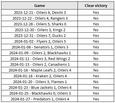 The good news for the Oilers is that over this 16-game winning streak, nine have been clear victories. They did have a stretch of six wins where only one was a clear victory, which made me think a loss was coming soon. But then they put up three straight right before the NHL all-star break.