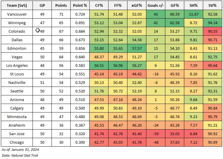 Below are the even-strength (5v5) numbers for each team in the western conference (sorted by points percentage), including goal-share results as well as the shot-share metrics that give us a sense of which teams have the right processes in place and if the results are sustainable or not. At the end of the table are each team’s shooting percentage and save percentage. I’ve also applied a basic heat map to each metric to show which teams are doing well or struggling relative to their conference foes (i.e., green is good, red is bad). You can also find a description of each metric at the end of this article. Please note that the shot-share metrics are score and venue-adjusted based on Natural Stat Trick’sTrick’s methodology.
