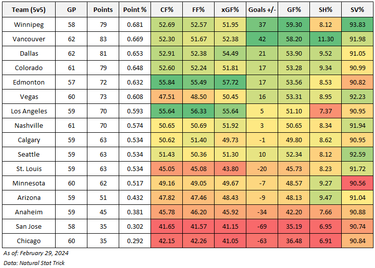 Below are the even-strength (5v5) numbers for each team in the western conference (sorted by points percentage), including goal-share results as well as the shot-share metrics that give us a sense of which teams have the right processes in place and if the results are sustainable or not. At the end of the table are each team’s shooting percentage and save percentage. I’ve also applied a basic heat map to each metric to show which teams are doing well or struggling relative to their conference foes (i.e., green is good, red is bad). You can also find a description of each metric at the end of this article. Please note that the shot-share metrics are score and venue-adjusted based on Natural Stat Trick’s methodology.