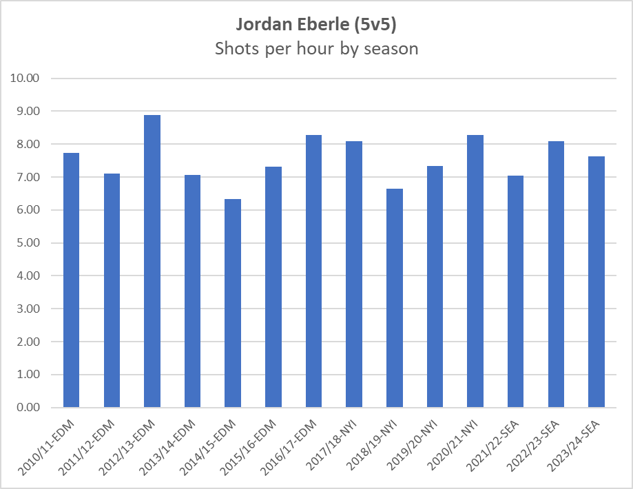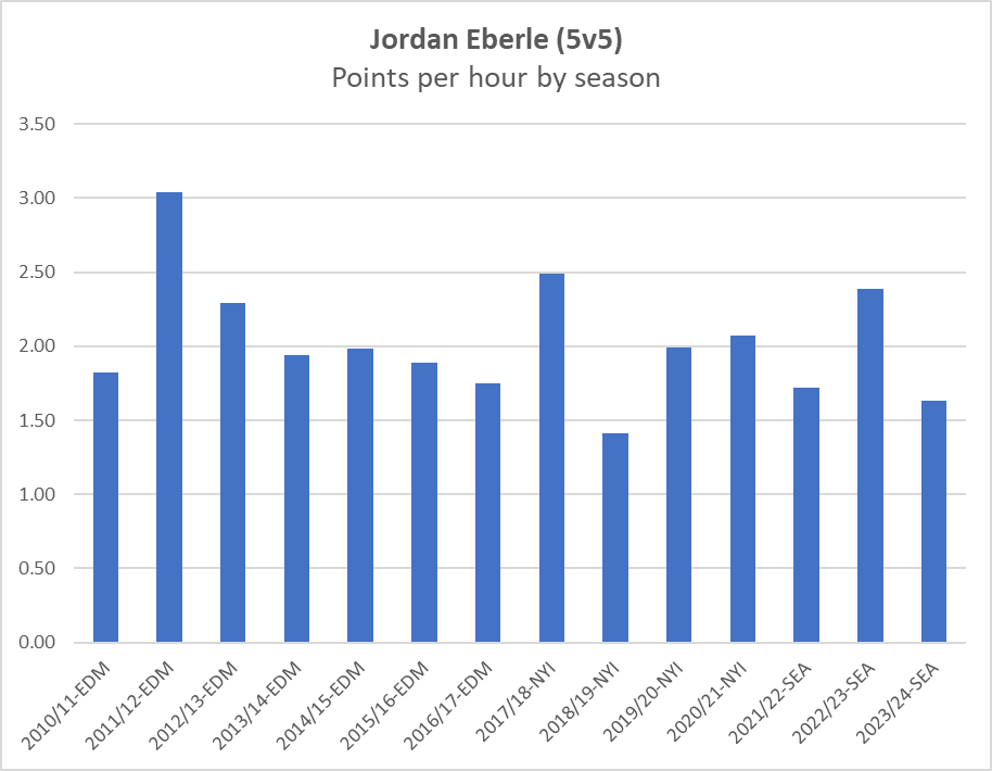 Over the course of his career, Eberle has been pretty consistent putting up second-line level points per hour at even-strength. This season, his rate has slipped slightly to 1.63 per hour, down from the 1.91 points per hour he posted in the previous five seasons.