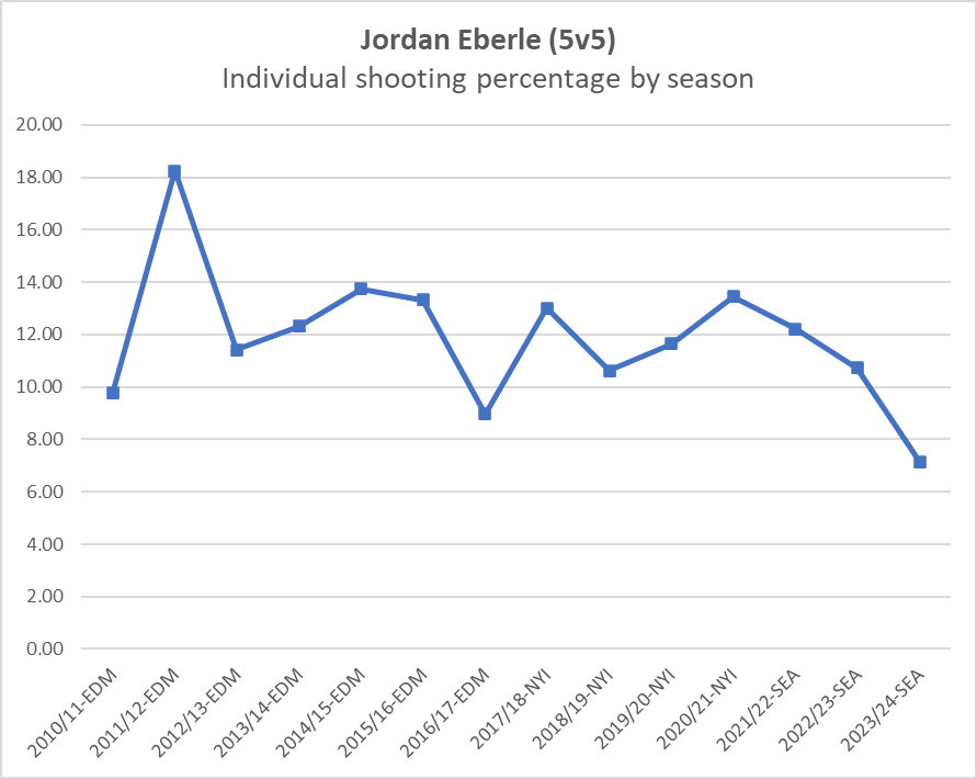 A key driver for his point totals declining is his personal shooting percentage, which is sitting at 7.14 percent this season. Looking at his historical numbers, there’s been some ebb and flow, but he’s been pretty consistent posting a shooting percentage of 11.74 percent over the previous five seasons. I’d like to think this season is an anomaly just based on how consistent he’s been in the past, but age and wear and tear might be catching up to Eberle.
