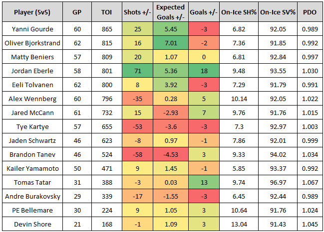 Eberle’s numbers really stand out here. He’s posting some of the best shot-based metrics on the team, indicating that his team tends to do better with him than without him.