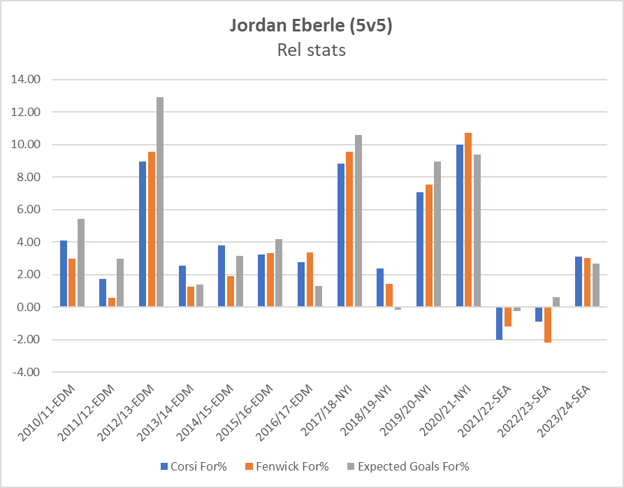 What’s interesting to note is that Eberle does appear to be having a bit of a bounce-back season. In the previous two seasons with Seattle, he was posting negative relative-to-team numbers – maybe because he was adjusting to a new system and playing some of the highest minutes on the team. Prior to that, he’d been consistently posting positive numbers, indicating his ability to help drive play and his team’s chances of out-scoring opponents. This season, his numbers appear to be back to where we would expect them to be, making me wonder if his productivity could improve, potentially as an Oiler.