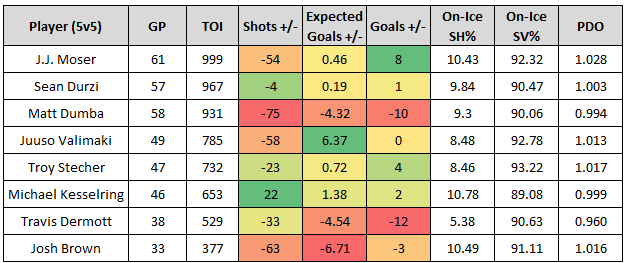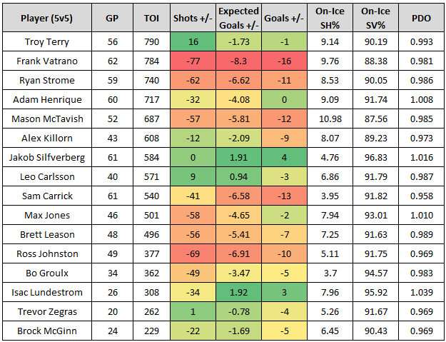Speaking of which, the table below lists the Anaheim forwards this season, sorted by their total ice-time, including each player’s on-ice shot differential, expected goal differential and actual goal-differential. I’ve also included each player’s on-ice shooting and save percentage along with PDO to see what could be impacting their actual results (i.e., goal differential). A basic heat map has been applied to show how each player compares to their peers.