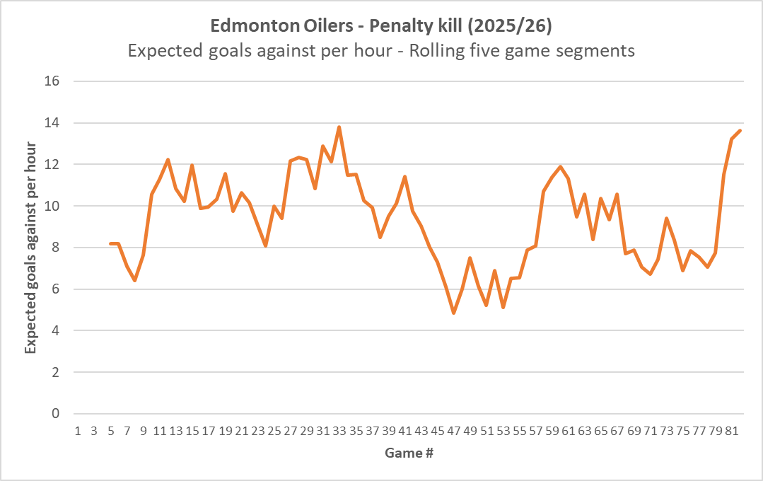 The chart below shows the Oilers’ expected goals against per hour on the penalty kill across the regular season, broken into rolling five‑game segments. The goal was to determine whether Edmonton had previously allowed scoring‑chance rates comparable to what we’re now seeing against Anaheim. I suspected they had—but I didn’t realize just how severe the spike was over the final few weeks of the season.