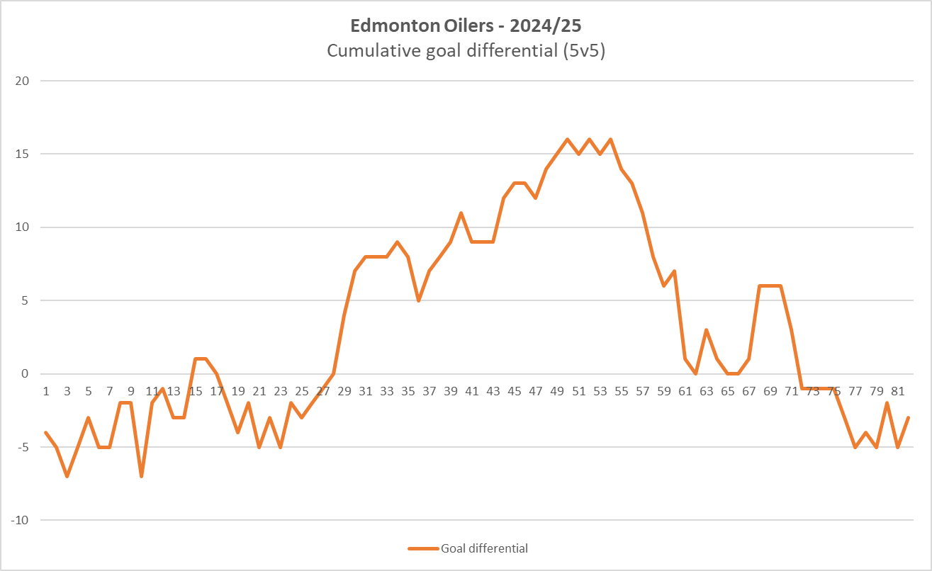 Both teams are also getting good results from across their rosters – scoring goals with and without their star players on the ice. Without one or both of McDavid or Draisaitl at even-strength, so about 50 percent of the team’s total time, the Oilers have posted a goal-share of 67.74 percent (21 goals for, 10 goals against). And on the other side, without one or both of Barkov or Tkachuk, about 46 percent of the team’s total time, the Panthers have also posted an exceptional goal-share of 66.67 percent (20 goals for, 10 against).