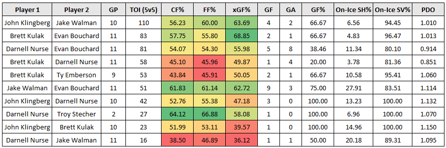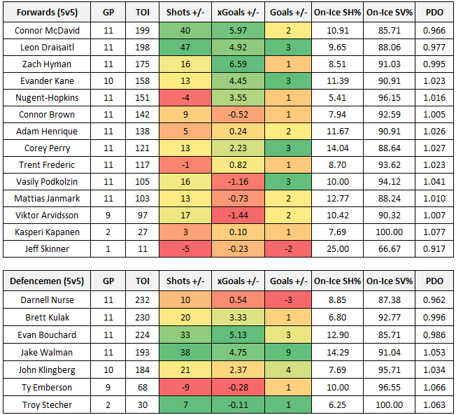 While there are some players riding the PDO wave, like the Lundell/Marchand/Luostarinen line (who have been excellent), there are others like Reinhart who have the potential to see their scoring pop at evens. Reinhart’s on-ice shot-share numbers have been excellent, but he has only broken-even in terms of goals. Suspect the Panthers coaching staff will heavily target Darnell Nurse, as well as Henrique, Brown and Janmark. As I wrote recently, the Oilers tend to allow a lot of shots with these players on the ice – a trend that has continued since the regular season.