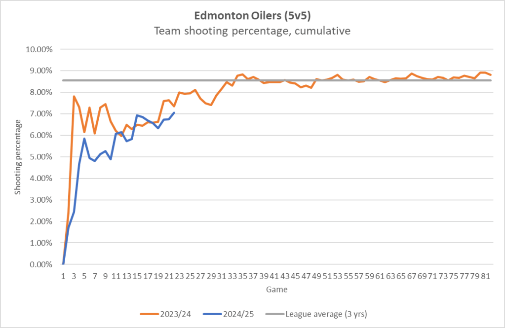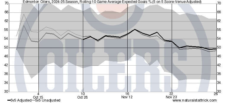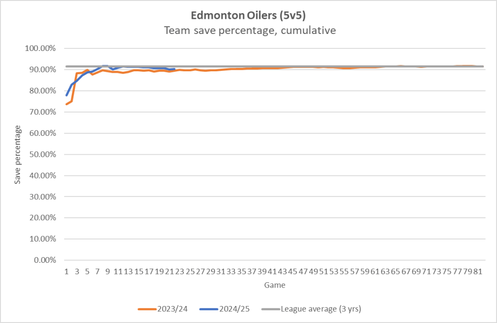 And as I wrote about a month ago, the team has also been getting a lot more shots from their defencemen, which isn’t ideal considering the probability of scoring drops off the further you’re away from the net. There appears to be more hesitancy to make plays and take some risks to get the puck moving into high danger scoring areas. Instead, the team is taking shot attempts from distance, and hoping the best for rebounds. This is a weird tactical issue that various coaching staffs have tried in Edmonton, and it just doesn’t work well.