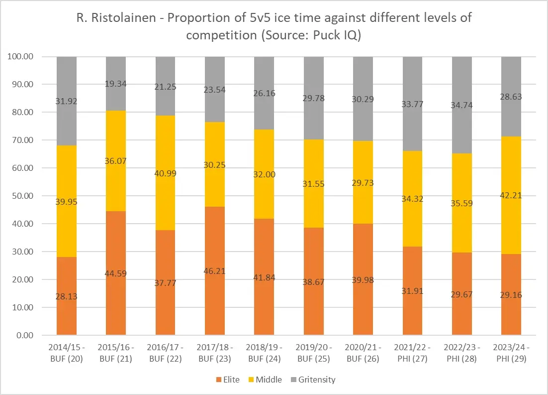 Philadelphia appears to have recognized that Ristolainen was getting way too much responsibility in Buffalo and had a plan to put him in a position to succeed once they acquired him. In the last few seasons with the Flyers, we see that his proportion of ice time against elite competition has dropped to more reasonable levels – around 30 percent. This is where he probably should have been, considering that his on-ice numbers in Buffalo were so poor.