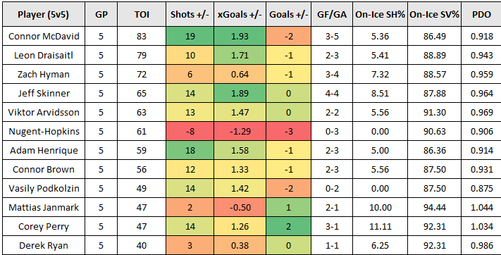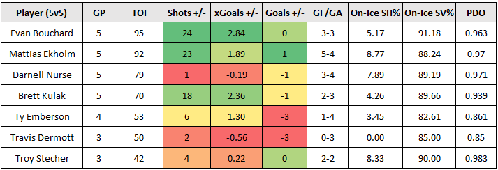 The top pairing of Ekholm and Bouchard is quite solid and helping tilt the ice. And Kulak has been steady with whoever his partner has been. The concern remains with the second pairing as Nurse has continued to struggle, with the team more often playing without the puck when he’s on the ice. As I mentioned prior to the season starting, the rest of the defensive options have been depth players for the majority of their careers, so it’s hard seeing any of them move up the depth chart. None have shown the ability to help boost their defensive partner’s on-ice numbers, which is something Nurse will need for that second pair to be successful.