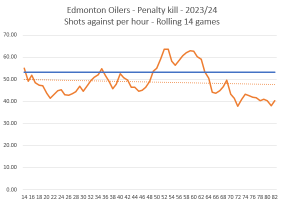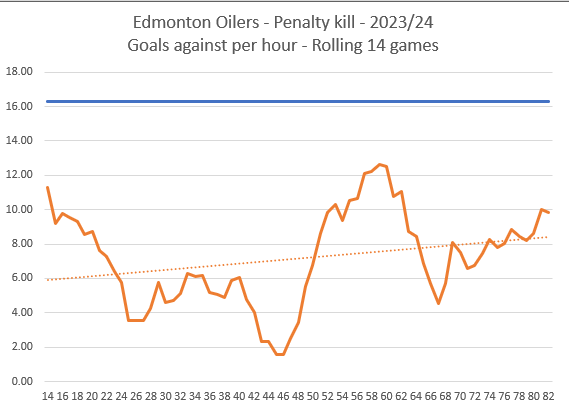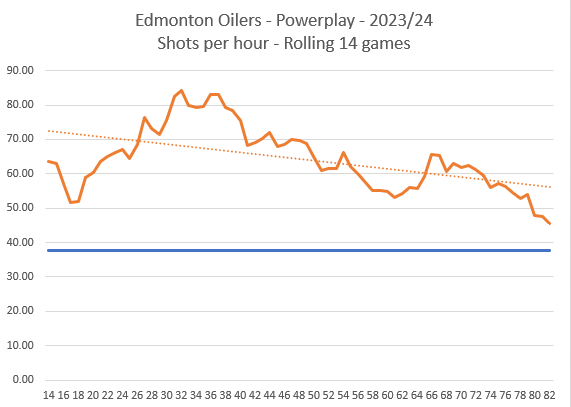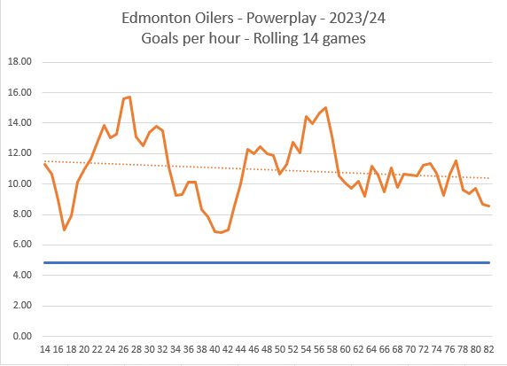 The Oilers abysmal output rate on the powerplay is a level they never reached last season. The graph below shows the Oilers rate of goals per hour last season in fourteen-game rolling periods, with the blue line across representing their rate from the first fourteen games this season (4.82).